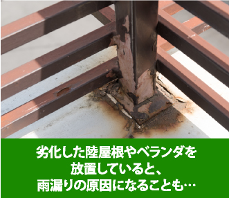 建物内に漏れ出した場合、雨漏りの他、各部の腐食・劣化を起こします。