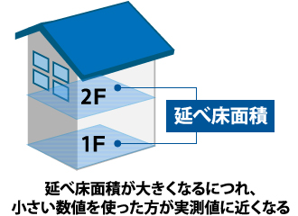外壁の面積が延べ床面積の1.1~1.4倍ということには驚いている方も多いのではないでしょうか。「これで正確な数値が出るの」と疑問にお思いの方もいると思います。問題は1.1~1.4の間でどの数値を使うかということですが、延べ床面積が大きくなるにつれ、小さい数値を使った方が実測値に近くなるという結果が出ています。