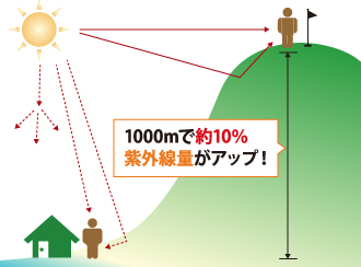 日焼けの原因になったり、建材を劣化させる原因となるあの紫外線です。 紫外線というと海の近くのイメージがありますが、実は高地の方がその量が多くなる場合もあります。 標高が高くなると、空気も薄くなります。 その結果、太陽光が散乱せず、そのまま届くようになり、紫外線も増えてしまうのです。 一般に標高が1000m高くなると、紫外線量も10%増えると言われています。