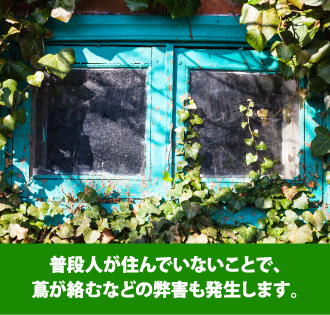 この他、建物の近くに植物が繁殖すれば、その蔦がお住まいに絡み、それが悪影響を与えることもあります。 また普段、人が生活していないため、適切に換気が行われず、湿度が室内に溜まってしまうこともあります。 建物を取り巻く環境に加え、人が普段住んでいないことも弊害になっていることもあるのです。