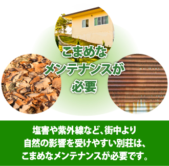 街中にある一般的なお住まいよりも手がかかってしまうのが別荘なのです。 頻繁に訪れるという方も、たまにしか訪れないという方も、街中の建物よりも早め早めのメンテナンスを心掛けてあげてください。 外壁塗装や屋根塗装といった塗り替えも街中の建物よりも早めの周期で行いましょう。 メンテナンス時期を逃してしまうと、落ち葉の堆積とそこに含まれる水分、塩害、平地よりも強烈な紫外線から一気に劣化が進み、取り返しのつかないことになりかねません。