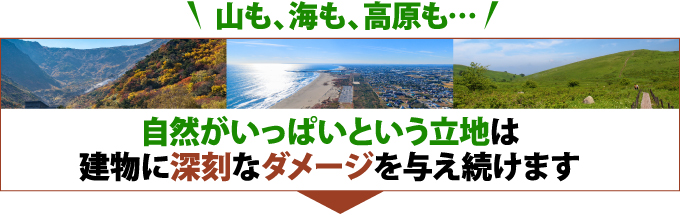 「海の近くは塩害があるから建物に厳しいことは分かるけど、山も高原もそれほど悪影響を与えると思えない。むしろ、高原なら湿気が少なくて良さそうな環境にも思えるけど」。 このように考える方もおられるでしょう。山、海、高原ではそれぞれどのようなことが起こりえるかを説明いたします。