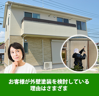 「同じ頃に建てられたご近所さんが外壁塗装していたからウチもそろそろかな」という方もいれば、「建物をしっかり維持・管理して資産価値を保ちたい」という方もいます。 また、「たまたま庭の手入れをしていて、久しぶりに家を見たら外壁がボロボロになっていてビックリした」という方もいます。 お子様の独立や定年退職を機に生活の質を変えるため、イメージチェンジしたいからということもあります。 前述のように訪問業者に不具合や老朽化の指摘を受けたからというものもあります。