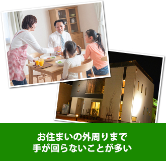 お住まいの中、お部屋などと較べるとお住まいの外周りというのはどうしても見る機会が少なくなりがちです。 朝早くに出勤し、夜に帰宅するご主人様などはご自分が所有しているお住まいでも外周りをじっくり眺めることはなかなかないでしょう。 朝は何かと忙しいし、帰宅するのは夜ですから辺りは暗くなってしまいますので、観察できる状態ではありません。休日はご家族でお出かけしたり、お部屋でくつろいで仕事の疲れを癒したりすることがほとんどだと思います。