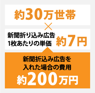 一般的に一世帯に折込み広告を届けるコストは約7円以上かかります。お安く感じられますが、30万世帯だと単純に210万円です。