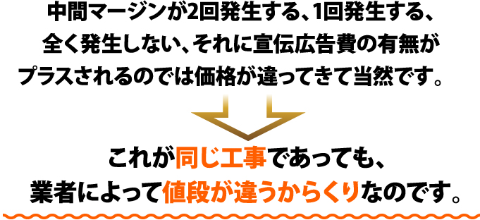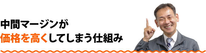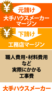 ハウスメーカーや工務店が中間マージンを多く取り、下請け業者に安値で発注すれば、下請け業者は材料費を削ったり、工事日数を減らしたりして、やりくりしないといけません。価格だけでなく、工事品質に違いが出てくるのもこういった実状があるからなのです。