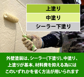 業者が材料費で価格を抑えようとした場合、規定された量を塗布せず済ませるという方法を使います。外壁塗装も、屋根塗装も基本的にはシーラーなどで下塗りをして、仕上げ用塗料で中塗りと上塗りを行います。