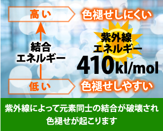 塗料の色の元は顔料ですが、こちらも原子同士の結合で構成されています。これら原子同士の結びつきの強さは結合エネルギーによって示すことができ、この結合エネルギーを上回るエネルギーを受けるとそれが破壊されてしまうのです。