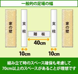 戸建て住宅の外装工事などの際に仮設される足場の幅は約60cmです。実際に足を乗せる踏板の幅が40cm、それを固定する支柱がそれぞれ10cmですから、理論的には合計60cmあれば仮設可能ということになります。