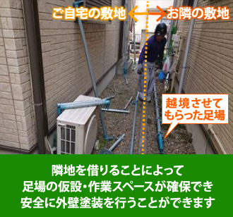 ●足場を仮設するスペースが狭くても、『狭小地用の足場を使う』、『お隣に越境させてもらう』などで外壁塗装をすることは可能
