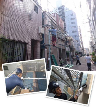街の外壁塗装やさんで狭小地に足場を仮設する場合、特に気をつけているのが仮設時と撤去時、また外壁塗装などの工事中です。