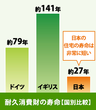 お住まいは長期に渡って使用される耐久消費財です。しかし、欧米諸国と比較すると日本のお住まいの寿命は非常に短いという事実をご存知でしょうか。 さまざまなデータの中でも日本の住宅の寿命の短さは際立っています。ドイツでは住宅の寿命は約79年、イギリスでは141年という数値があります。それに対して日本はたった27年です。少なくとも欧米では日本人の平均寿命と同じくらい住宅を維持し、数世帯に渡って暮らし続けています。世界一の長寿命を誇る日本人なのに、なぜか一つの家に住む期間は少ないのです。欧米に対し、3分の1から5分の1程度の寿命しかない日本の住宅、これは改善していかなければなりません。