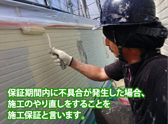 業者が行った工事、外壁塗装や屋根塗装に対する保証。外壁塗装や屋根塗装を行った箇所の状態と使用した塗料に応じて保証期間が定められる。業者が独自に行うこともあれば、業者が加入している団体・組合などが行うこともある。