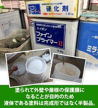 塗料は外壁塗装や屋根塗装に使われて、それが完成するまではその目的を果たしていないということです。塗料が塗られて乾燥し、外壁や屋根が防水性などの健全さを取り戻して初めて完成形となるということです。