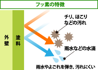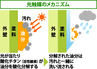 外壁に付いた汚れを分解する光触媒、色褪せしにくい無機系ハイブリッド塗料、雨によって汚れを落とす親水性、汚れにくさを実現するフッ素系の技術などが実用化されたのです。