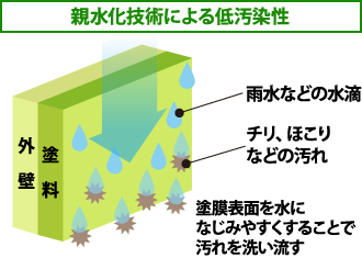 非常に水に馴染みやすくなる親水性を持った塗料やコーティングをすることによって汚れを洗い流せるようにしたものです。