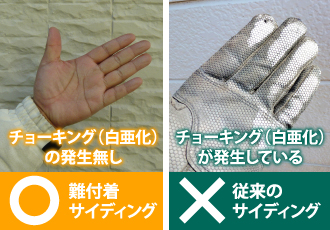 難付着サイディングボードの最大の特徴は「いつまでも綺麗が長続きする」ことです。色褪せしにくく、チョーキングも発生しにくいのです。