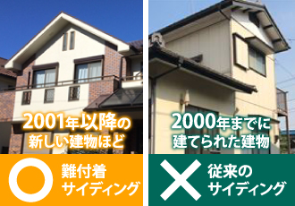 光触媒などの技術が実用化され、製品として拡がりはじめたのは2001年以降です。よって、2000年までに建てられた建物は難付着サイディングではなく、従来のサイディングと考えられます。
