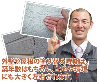 点検は無理をしないで、見える範囲だけでも大丈夫です。上記の症状が出たら、塗り替え時期の目安となります。一度ご相談ください。悪いところは早期に発見し、迅速にケアしてあげれば、大事に至ることはありませんし、費用もお安くなります。