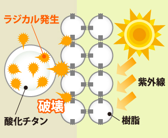 塗料の色付けに使われる顔料、酸化チタンは紫外線を受けると様々なもの分解してしまうラジカルを発生します。