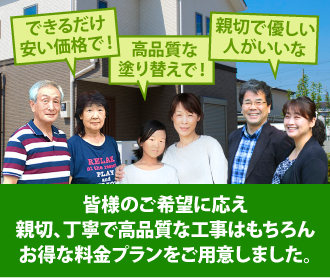 プランに含まれていない塗料で外壁塗装、屋根塗装をしたいという方、ぜひご相談ください。親切で丁寧、なおかつ高品質、しかもできるだけの低価格で対応いたします。