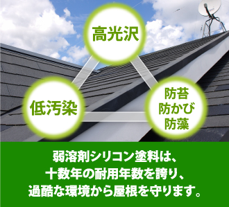 同じシリコン塗料でも水性より強いのが弱溶剤シリコン塗料です。低汚染、高光沢、防苔・防かび・防藻といった機能も高く、十数年の耐用年数を誇ります(耐候形1種※)。