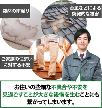 例を挙げるなら、『突然、雨漏りがはじまってしまう』こともあります。また、『年取ってきたせいか、玄関などの段差に不安を感じるようになってきた』ということもあるでしょう。