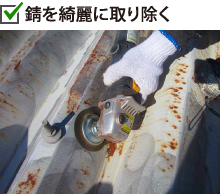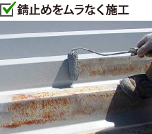 錆の再発と拡大を防ぐためにケレン作業で錆を削り落とします。波型の折板屋根はケレン作業が非常に大変ですが、錆をしっかり落とさないと錆ごと塗膜が剥がれてしまったり腐食による穴あきを起こしてしまいますので最も大事にしたい作業工程です。 またボルト周辺の錆が進行している場合はシーリング補修で隙間を塞ぐなどの処理も行います。