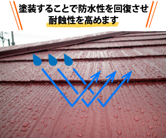 そもそも塗装の本来の目的は防水性を回復させることによって、耐蝕性を高めるためのものだからです。金属に塗装すれば水と直接触れることがなくなりますので、錆びにくくなります。スレート屋根も同様です。雨水に直接触れることがなければ吸水も起こりません。
