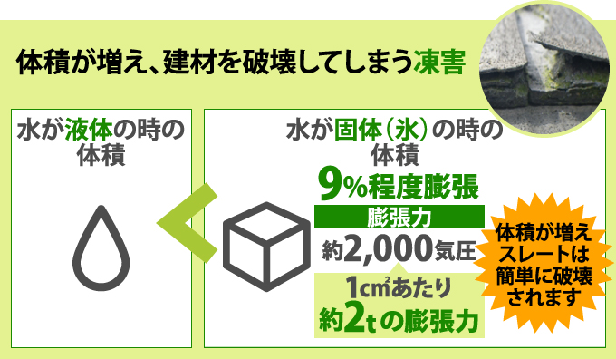 水が液体から氷の固体になると体積がおよそ9%程度膨張します。その膨張力は約2,000気圧に相当しますから、1c㎡あたり約2tです。これだとどんなものでも簡単に壊れてしまいます。