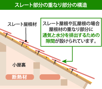 スレート屋根も屋根材と屋根材の重なり部分は全て屋根材の下に通じる隙間です。この隙間は非常に狭く、屋根塗装をしてしまうと塞がってしまうこともあります。塞がったままにしておくと、水蒸気や入り込んだ雨水を排出できなくなり、雨漏りしてしまうのです。