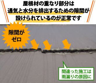 これらは通気のための隙間であって、結露の原因となる水蒸気や屋根材の下に入り込んでしまった雨水を排出とするためにあるのです。屋根は密閉されているわけではないのです。