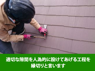 スレート屋根を塗装した後、適切な隙間を人為的に設けてあげる工程を縁切りと言います。昔はスレート屋根の屋根材と屋根材の重なり部分に革すきやカッターで切り込みを入れて、塗料で覆われてしまった隙間を再度、確保していました。かなり作業時間がかかる工程で80㎡程度の屋根の場合、2人がかりで約8時間もかかっていました。関係ない部分の塗膜が傷ついたり、重なり部分の塗膜の乾きが遅く、剥がれてしまったりといろいろと苦労の絶えない作業だったため、現在では違う方法で縁切りが行われるようになりました。