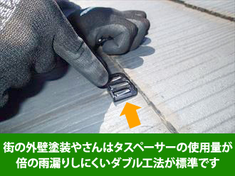 現在ではタスペーサーという製品を使って縁切りが行われています。下塗り後にポリカーボネイト製のタスペーサーを屋根材と屋根材の重なり部分に挿入し、中塗りの前に適切な隙間を確保するという工法です。タスペーサーはバネの構造を持っており、踏んでも割れることがありません。また、下塗り材や塗料、それらを希釈するシンナーなどで溶けることもありません。ただし、実際の施工では希釈用のシンナーや下塗り材用の塗料で溶けてしまう万が一のリスクを避けるため、下塗りが乾燥した後に挿入します。