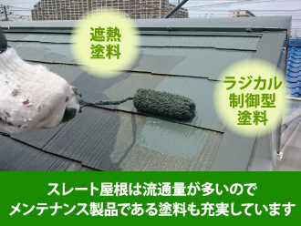 前述の通り、スレート屋根は流通量が多いのでメンテナンス製品である塗料も充実しています。夏の暑さを防ぐ遮熱塗料もあれば、色褪せなどの美観に拘る方はラジカル制御型塗料も選べます。これらの塗料はほとんどが専用の下塗り材が用意されているので、傷みが激しくなると塗れない(塗っても数年程度しか持たない)ケースも出てきます。