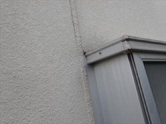 外壁はモルタル造りでした。誘発目地があるしっかりとした施工です。誘発目地は特定の部分だけ薄くし、力などが掛かった場合、そこが割れるように作られた部分です。モルタルの弱点であるクラックを特定の箇所に誘発するようにしてあるので、修理も楽になります。こうした誘発目地は施工に手間がかかるため、作られないことも多いのです。屋根葺き替えよりも外壁塗装をした方がいいと言った理由がなんとなく分かる気がします。