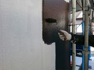 今回、外壁塗装に使う塗料はパーフェクトトップです。まずは全体を下塗りしてから中塗りに入ります。色はH09-20Bで、ご覧通り焦げ茶色になります。
