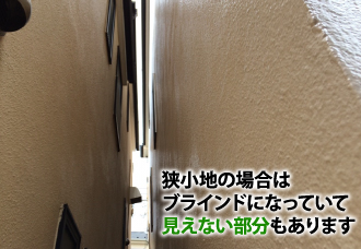 当たり前のことですが、お見積もりの時には足場が仮設されていません。したがって、どうしても足場が組まれてはじめて近くで見ることできる部分というのも存在します。 平屋ならばそういった部分はほぼないのですが、2階建て以上になるとそういった部分もでてきます。狭小地の場合はブラインドになっていて見えない部分もありますし、3階建てともなるとそういった部分も多くなってきます。