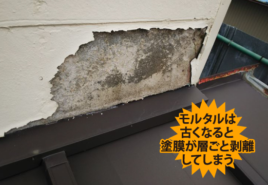 厄介なのがモルタル外壁です。こちらは古くなってくると塗膜がその層ごと剥離してくることがあります。きちんと密着している部分としてない部分では打診音で判断できるのですが、見積もり段階の足場がないケースではそれができる範囲も限られます。 この場合、お見積もり段階では打診できた面積のうち、どれだけ密着していなかったかを計算し、金額を提示しています。正確な金額をお伝えできるのはやはり、足場を仮設してからとなります。