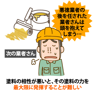 下塗りの段階で現場を放り出すのはこれ、本当に困ります。中塗りまで済んでいれば、次の外壁塗装を早めにしようと考える方もいるでしょう。中塗りの途中であれば、お施主様が「これだけの追加を払うから中塗りだけは済ませてくれ」と値切った交渉もできます。本当に悪意のある業者で下塗りにこれから塗ると言っていた塗料と相性が悪いものを塗っていれば、次に来た業者がそれを信じて塗装した場合、すぐに剥がれてきます。責任の所在が下手をしたら、次に来た業者になってしまうわけです。 悪徳業者には他のことに頭を使って欲しいものです。