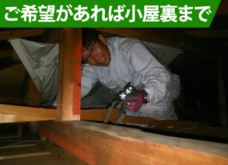 私達は建物を大事にしてもらい、そこに長く住んでほしいから無料で点検を行っています。また点検の際も、お見積もりの際も建物を細部まで見て、追加料金などが発生しないようにしています。