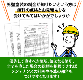 外壁塗装がどれくらいかかるのか知りたいという方は一度、無料の点検とお見積もりを受けてみてはいかがでしょうか。 その際に外壁塗装や屋根塗装だけでなく、他の塗りたい部分をおっしゃっていただければ、もちろんそこについてもお見積もりをいたします。 また、お客様が工事をしたい部分以外に追加工事となりそうな優先すべきメンテナンスがある場合はそのこともお伝えします。 優先して直すべきところと気になるところ、全てを直した場合にかかる総額を知っておけば、計画も立てやすくなるし、予算の都合もつけやすくなるでしょう。