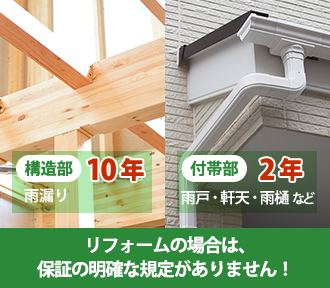 では、リフォームの方はどうなっているかというと、瑕疵保険などはありますが任意の加入であり、明確な規定はありません。会社や業者によってバラバラというのが実情です。
