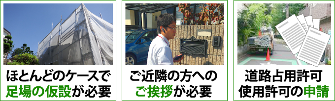 まずほとんどのケースで足場の仮設が必要不可欠ですし、そのためにはご近隣の方へのご挨拶、道路に足場がかかるケースでは道路占用許可・使用許可の申請も行わなければなりません。